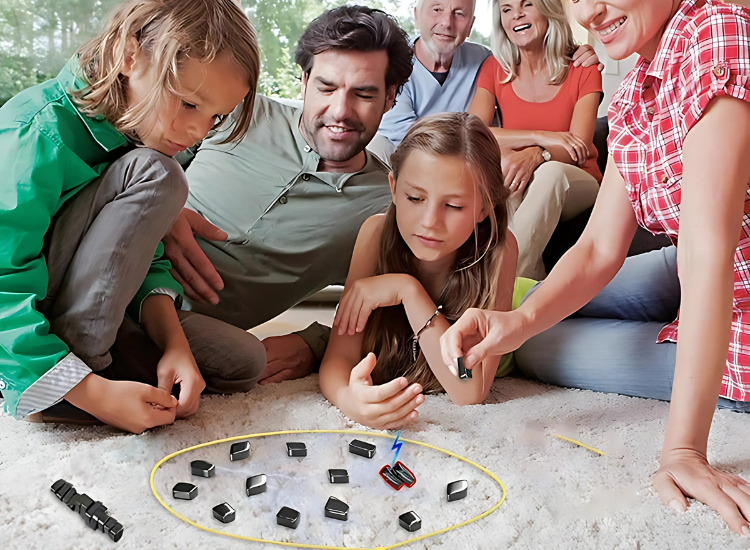 De spelers leggen om beurt een magneet in het speelveld. als jouw magneet andere magneten aantrekt, moet je deze pakken en is jouw beurt voorbij.